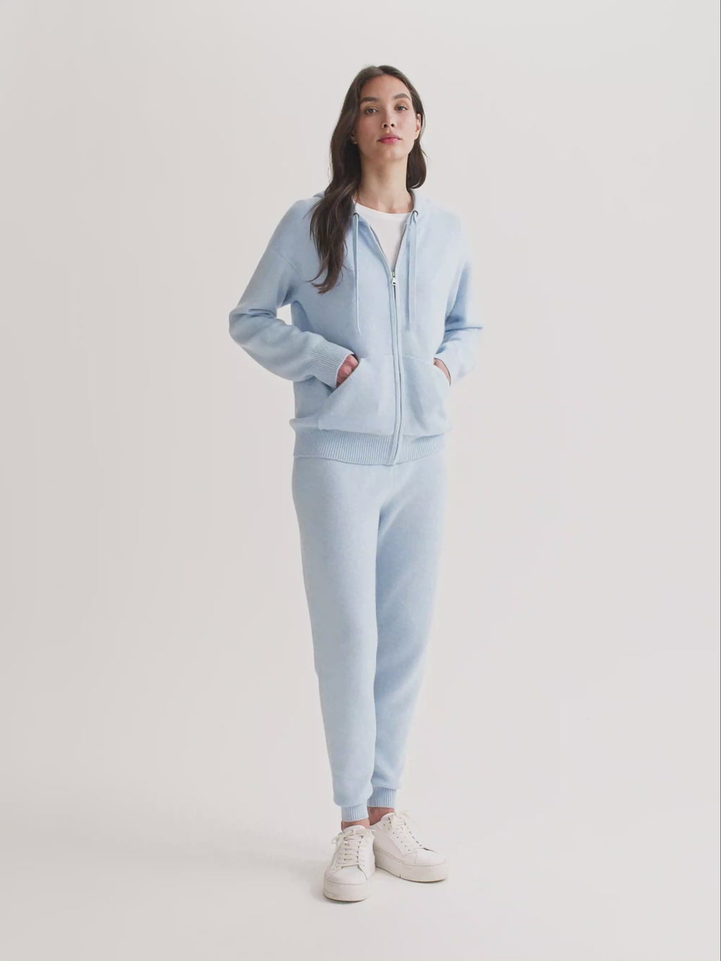 Wrap yourself in pure comfort with the Daphne Hoodie in glacier blue—a relaxed-fit zip-through style crafted from 100% Italian Cariaggi cashmere. Supremely soft and lightweight, this hoodie offers the perfect balance of laid-back luxury and everyday versatility.